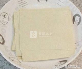 3.焯好的豆皮过凉水,切去四周的硬皮,并且成方形。