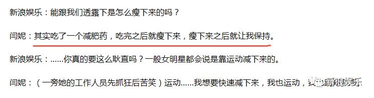 对于女明星如何瘦下来这个问题,感觉还是闫妮最实在,记者问她怎么瘦了,人家很干脆的回答:吃减肥药呗!(但是也有运动,看来健身才是王道啊)