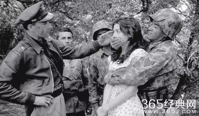 库布里克凭借他多年摄影的经验,造就了这一精妙的构图:同时展示出了少女脸上的恐惧与士兵心中的欲望。