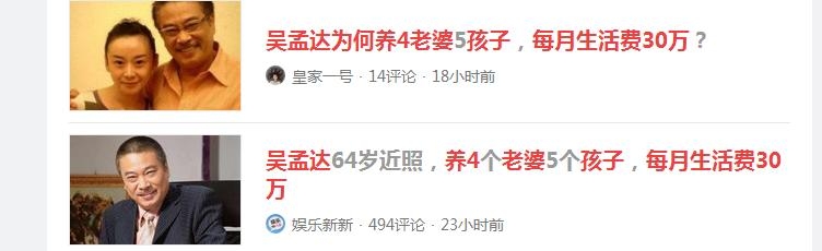 据台湾媒体报导吴孟达一个月要给每个老婆80万元的生活费,说他一年至少要拍20部电影才能吃出这样的赡养费用。现在说是降到了30万。
