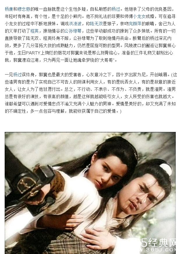 杨过,这个平淡无奇的男子是《神雕侠侣》中的主人公,杨康与穆念慈之子,西毒欧阳锋的义子。继承了父亲杨康的撩妹技能并且发扬光大,别人撩妹都是有目的的,杨过就是简单的撩着玩了又不上的那种,,一见杨过误终身不是白说,见女孩就说你长的好像我姑姑,把别人撩起来了,我只喜欢我姑姑一个,对郭襄可以说是撩妹的最高境界,把一个纯情少女撩成了尼姑。