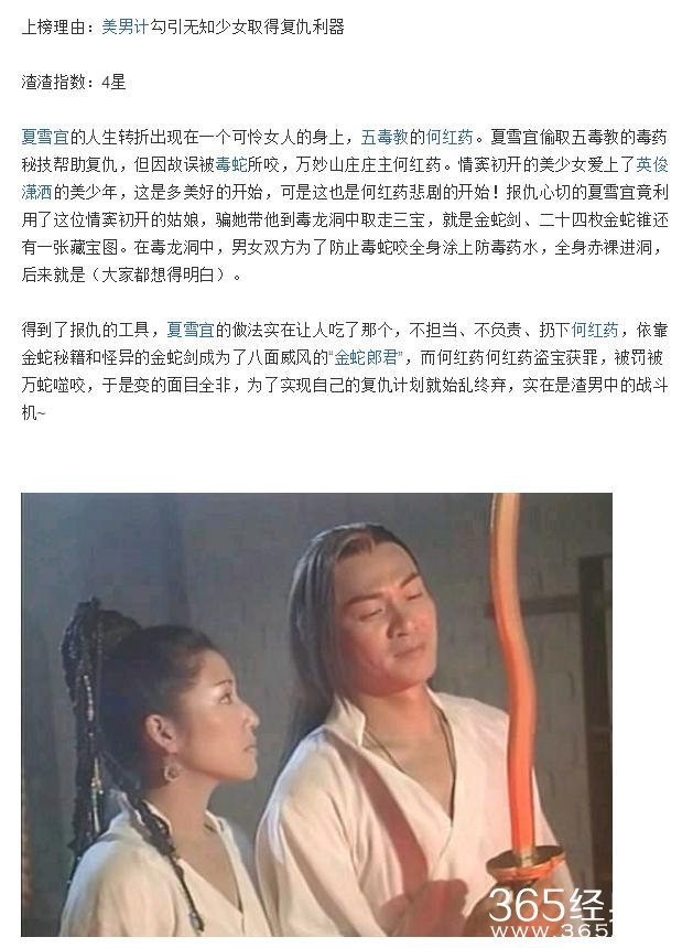 5.金蛇郎君夏雪宜,《碧血剑》中的隐形主角,名号「金蛇郎君」,并没有正式出现,却是一极重要之人物,故事中很多情节都始自於他(女主角温青青、「仙都派」、「五毒教」)。