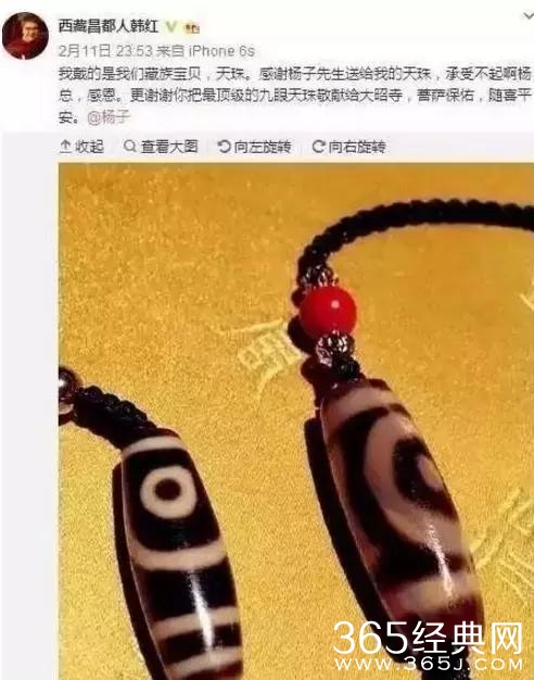 韩红作为西藏人,在践行藏传佛教的时候,又怎么能少的了天珠呢。韩红在微博上晒的就是天珠