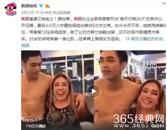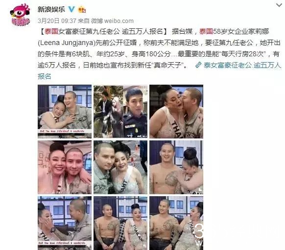 6、不得不服泰国的那位女富豪,3月20日,58岁的女富豪公开征第九任老公,要求年轻鲜肉,“每天行房28次”,竟然超过5万人报名。