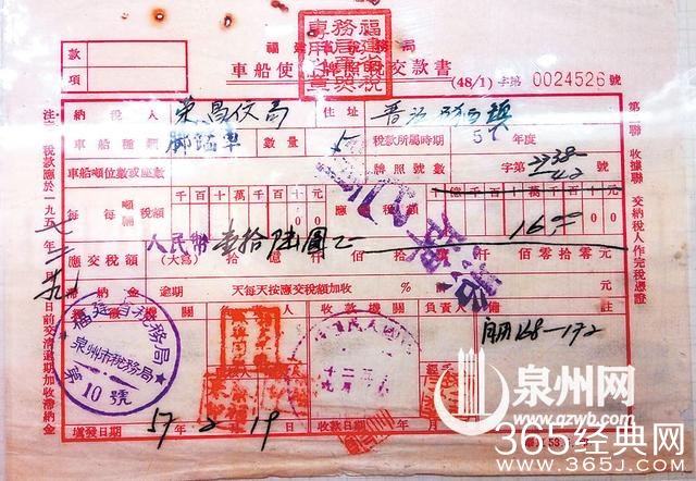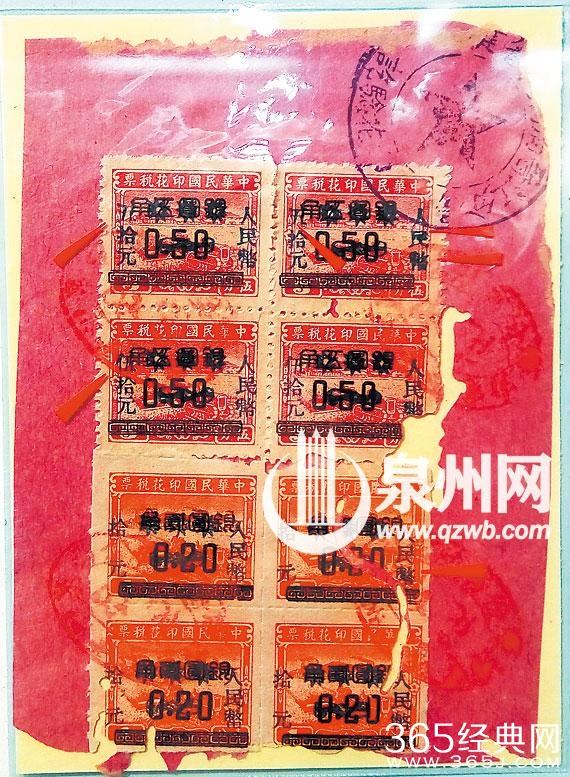 这些饱经沧桑、泛黄的清代以来的土地契税、发票、护照、证书……仿佛一下子让人穿越时空,领略背后的时代背景和历史故事。“这几张实贴印花簿折残片及少许印花,是新发现的两种面额的农工图盖银元再改盖人民币印花税票。”万冬青介绍,附图残片贴10元和50元四方连,共计240元,销椭圆形红色印泥“泉州电灯电力股份有限公司,印花”章,该公司是一家创办于1912年的侨办企业,系泉州首家电厂,上世纪50年代被公私合营。另盖一枚蓝色“福建省税务局晋江分局,印花验讫”章,1949年9月10日泉州军事管制委员会财经处派军代表宋丹亭等接管福建区国税管理局晋江稽征局,设立福建省税务局晋江分局,局址在中心市区大隘门内,辖城区、南安、惠安等办事处,地方税机构分县设立县地方税征收处。1950年4月,国税和地方税务机构合并,改称泉州专区税务局,辖晋江、南安、惠安、安溪、永春、德化、莆田、仙游、同安等县人民政府税务局。“泉州解放初使用的银元加盖改值票系首次发现,对了解泉州地区发行使用解放区税票很有益。”万冬青说,这些看似普通的税票,其实隐含着丰富的工商史料和财税知识,自然会成为一些收藏者的“猎物”。