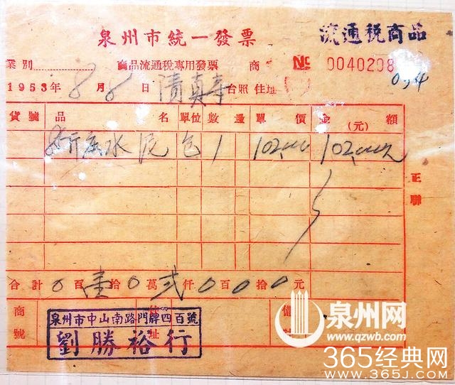 1922年贴加盖“晋江”字样长城图印花税票的泉州打锡巷(今称“打锡街”)金店发票
