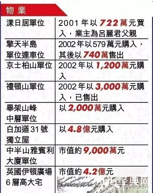 她和刘銮雄交往的6年间就收下了几处价值不菲的豪宅,黄埔花园两单位:约1300万元;比弗利山连天台单位:约1280万元;位于巴黎一单位:约500万元。