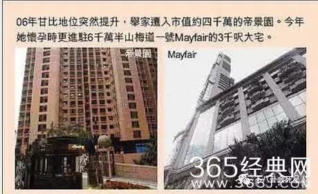 在生孩子之前甘比就已经有了个三处房产,生了孩子之后更是母凭子贵的,获得了5.4亿的山顶歌赋山里独立屋、高士美道五号、湾仔一环。