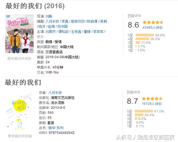 小说和电视剧的评分不相上下。青春本就不复杂,小说也是如此简单的青春故事,简单的娓娓道来,总以为长大后的我们才是最好的,原来曾经那个简单的青春,却是最好的。