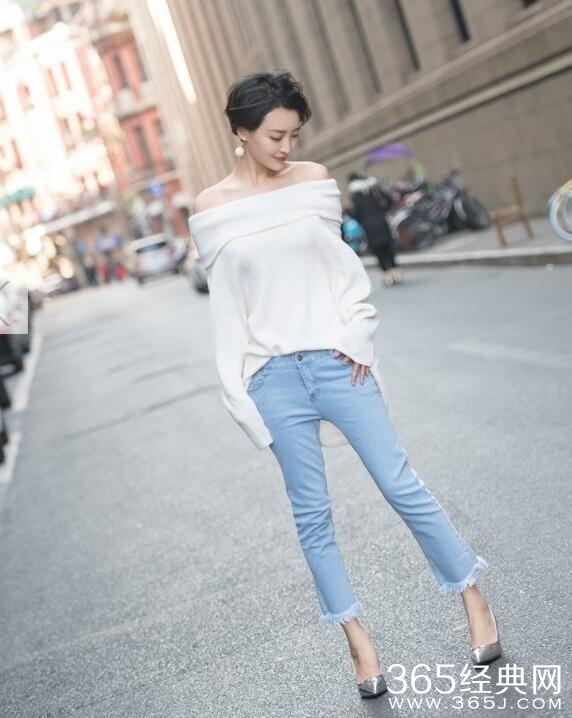 杨洋短发着米白色毛衣小露香肩,秀出完美的天鹅颈、一字骨。