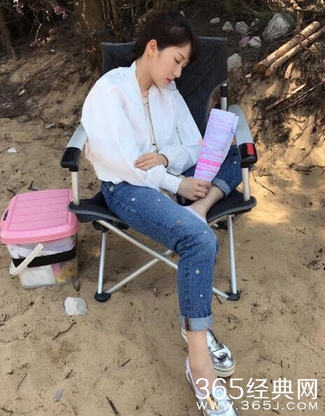 李念身穿白色上衣搭配牛仔裤,小憩一下。