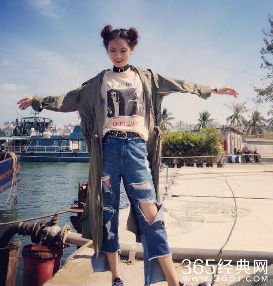 张予曦,身穿T恤和破洞牛仔裤的她肤白貌美,哪吒头抢镜。