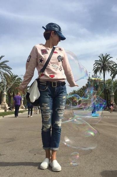 马伊琍头戴牛仔棒球帽,身着粉色印花卫衣,配一条破洞牛仔裤,脚蹬一双白色乐福鞋,显得年轻又俏皮。从照片中可以看出,她应该是在某公园春游。而她本人正将两手撑开学着小鸭子的动作,扭头和身边的泡泡玩耍。