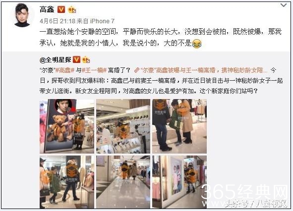 日前,网曝《情深深雨蒙蒙》中尓豪的扮演者高鑫已与妻子王一楠离婚,并被拍到携妙龄女子及女儿温情逛街,该妙龄女子疑为高鑫新晋女友。就在众网友看着曝光照猜测高鑫王一楠是否真离婚时,高鑫对此回应称:“小的是情人,大的不是。”并疑似默认离婚传闻。