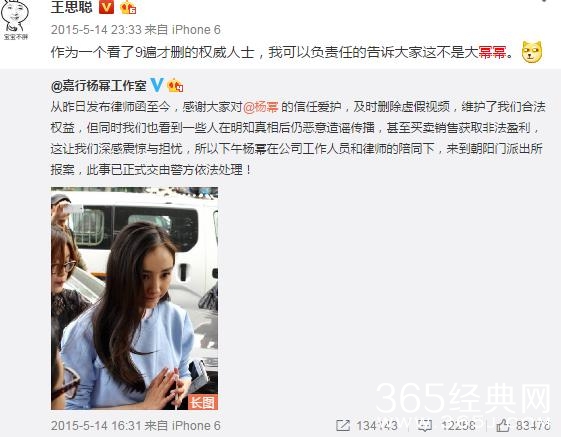 王思聪说欣 赏杨幂,并不是动动嘴 皮 子,行动上也是很给 力的。网上爆 出杨幂的不 雅 视 频,王思聪挺 身 而 出,作为个看了九遍才删除的权威人士认证,里面的女主人公并不 是杨幂。