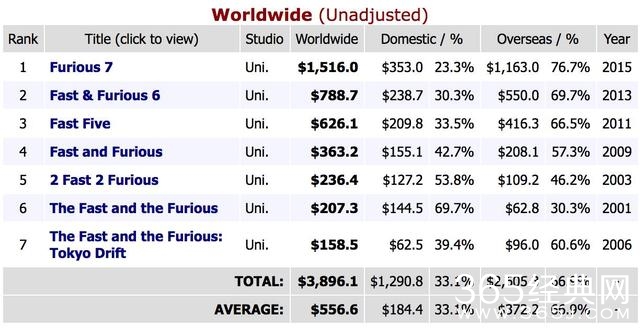 从以下《速激》系列的全球票房就能感知到,《速7》比《速6》多了整整7.3亿美元的票房。