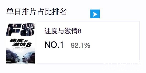 根据数据显示,2017年4月14日这天,《速激8》的内地预排片将达到了恐怖的92.1%。