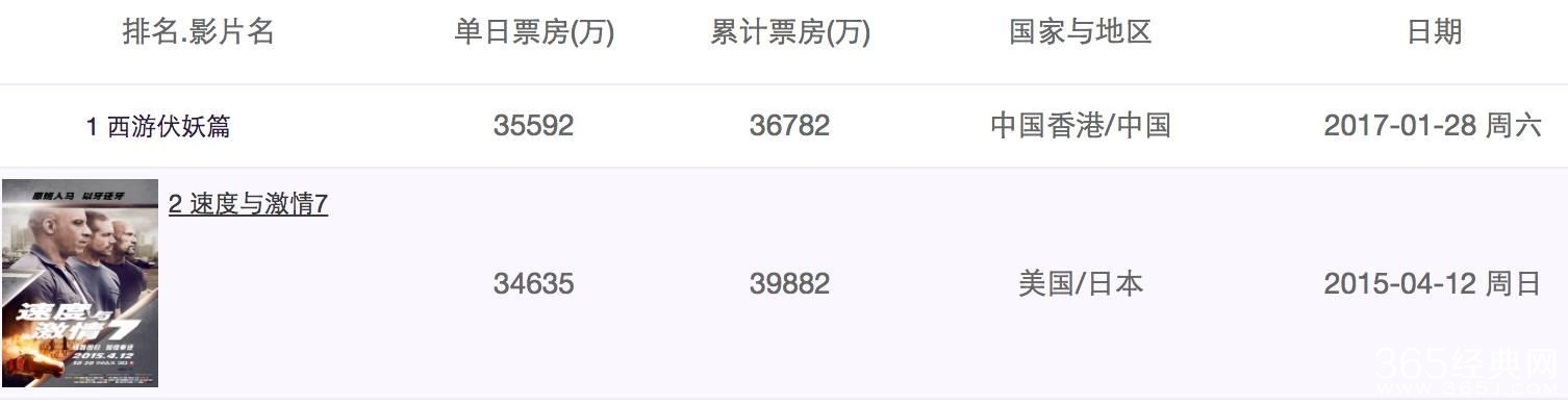 而《速度与激情7》在2015年4月12日,创下的恐怖的3.4亿人民币的单日票房,直到今年的大年初一,才被《西游伏妖篇》超越。