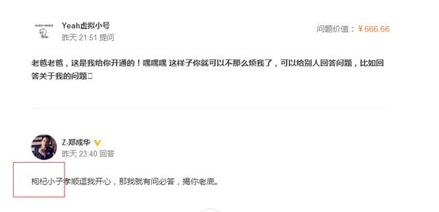 此外,在另外一个问题中,郑爽给老爸开通问答,郑爽老爸再次提到一个人名字:枸杞小子孝顺,逗我开心,那我就有问必答,接你老底。