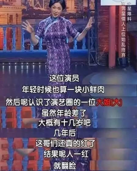 这个猛料,还是金星她爆出来的。在《金星秀》里,金星她称自己的好姐妹被小鲜肉追,这位大姐她为了鲜肉演员还给导演下跪。小鲜肉他红了以后就把大姐踹了,因为两人不般配。不过更有人称是什么男星煲汤送温暖,明明他就是孙红雷积劳成疾,得了胃溃疡,丁嘉丽她照顾有周。
