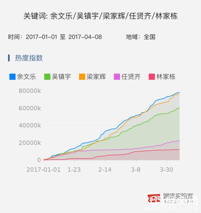 今日头条《媒体实验室》热度指数显示,在近三个月(1月1日-4月8日),五位影帝候选人热度值最高的是余文乐,排在第二的梁家辉热度值和余文乐不相上下,排在后面的依次为吴镇宇、任贤齐、林家栋。