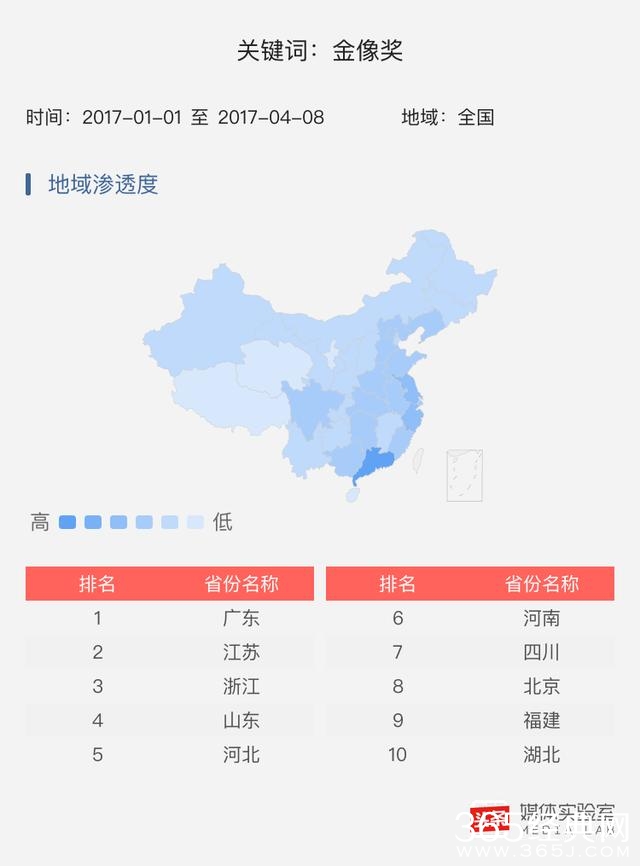 头条君也对“金像奖”的近三个月数据进行了分析,最关注“金像奖”的网友集中在广东省,排在第2-5位的是江苏省、浙江省、山东省、河北省。