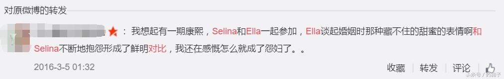 Selina虽然结婚,但是婚姻貌似不顺利,最后也以离婚而终。在《康熙来了》有一期中,Ella都是在秀丈夫恩爱,而Selina都是在吐槽生活,不禁让人感慨万千!