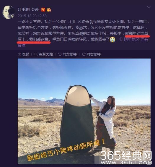 江一燕:在西藏阿里拍戏时找不到厕所,当地药店老板通知她能够“就地处理”……幸亏,后来剧组给她建了一个挪动厕所!小编真的很猎奇到底里面是怎样样的?