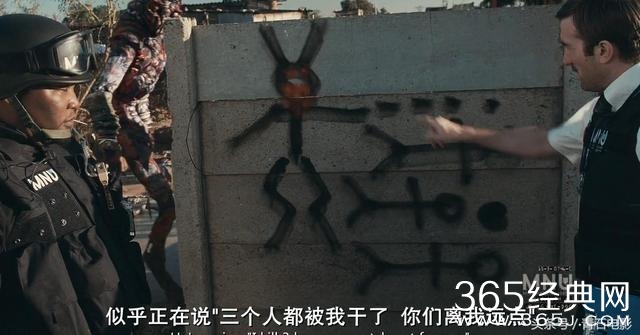 (片中人类与外星人和谐共处的标志,注意旁边是拿枪的士兵……)