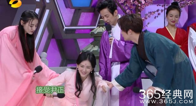 因为谢娜蹲下后,何炅和尹正也一同蹲下同她讲话