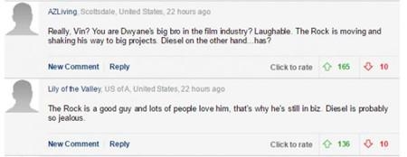 最后范·迪塞尔也补充:「当一个老大并不是很容易,何况现在有两个老大,当老大就是很容易惹人厌成为箭靶。」范·迪塞尔这一段访谈被不少影迷热议,许多网友都认为范·迪塞尔在强调自己是巨石强森「大哥」的姿态,比起解释他与巨石强森的不合传言,范·迪塞尔似乎更想吹捧自己的成就,有网友就表示:「巨石强森可以立刻把这个小丑掐死」、「他们站在一起的照片太诈欺了,巨石强森可以不用流汗就打倒他」、「范·迪塞尔认真吗?你说你是好莱坞罩着巨石强森的大哥?太可笑了,巨石强森靠着自己的魅力去接演各个大片」这些留言都引起了不少网友的按赞表达认同。