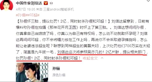 刘信达并表示,这次将参照吴亦凡的1.2亿片酬,提议相关部门处罚孙俪1.2亿,并封杀孙俪和邓超。