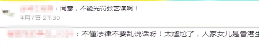对此有网友力挺刘信达:不能只罚张艺谋,也有网友吐槽:不懂法不要乱说话,人家女儿是在香港生的。