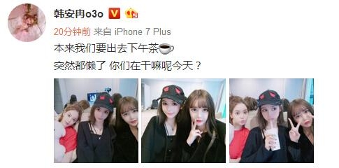 韩安冉爆照说:本来我们要出去下午茶️,突然都“懒”了 你们在干嘛呢今天? 中间的“懒”是什么意思呢?还是打错字了呢?想不明白!