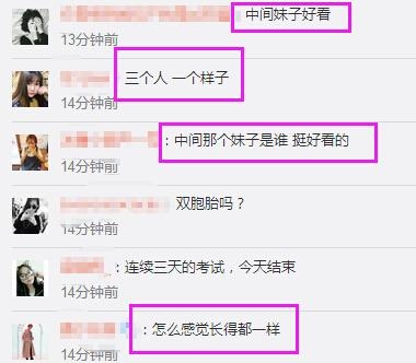 网友看照说:三个人一个样子,中间那个妹子是谁?挺好看的。怎么感觉长得都一样!