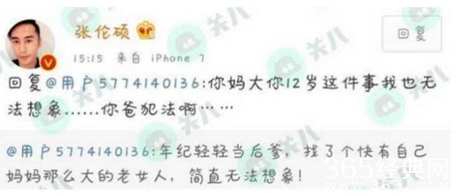 黑粉在底下留言嘲讽“年纪轻轻当后爹,找了个快有自己妈妈那么大的老女人,简直无法想象!”而张伦硕舍不得爱妻的年纪遭讥,便反击写下:“你妈大你12岁这件事我也无法想象,你爸犯法啊”,虽然事后可能怕引发争议删掉留言,但他直接怼黑粉的行为,被赞超有男人味。