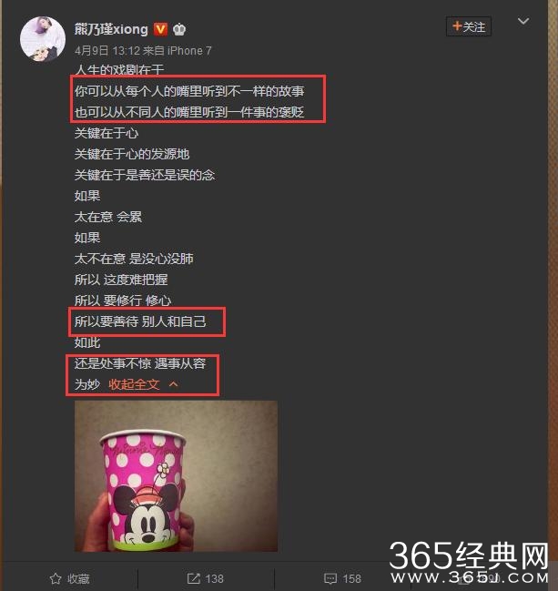前天熊乃瑾发微博说:人生的戏剧在于,你可以从每个人的嘴里听到不一样的故事,也可以从不同人的嘴里听到一件事的褒贬。。。。疑是对绯闻事件的回应,而且微博后半段:太不在意 是没心没肺,所以 这度难把握,所以 要修行 修心,所以要善待 别人和自己.....被网友猜想是在安慰宝强离婚一事。