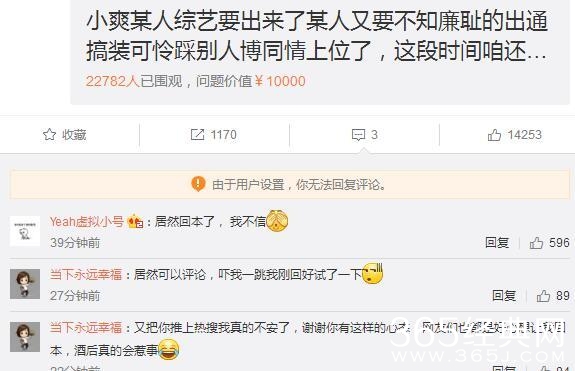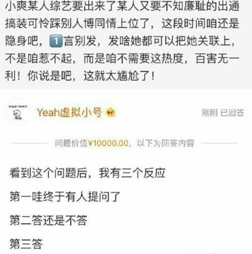 4月10日,因为粉丝在微博问答上问了郑爽一个问题,爽妹子又不小心上热搜了,问题是这样的,“小爽某人综艺要出来了某人又要不知廉耻的出通搞装可怜踩别人博同情上位了,这段时间咱还是隐身吧,1言别发,发啥她都可以把她关联上,不是咱惹不起,而是咱不需要这热度,百害无一利!你说是吧,这就太尴尬了!”