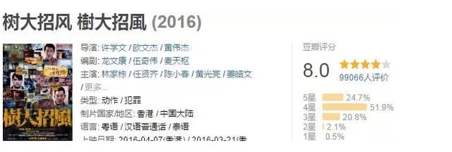 《树大招风》是一部由寰亚电影制作有限公司、海润影业有限公司出品,银河映像制作,杜琪峰、游乃海监制,许学文、欧文杰、黄伟杰联合执导,陈小春、任贤齐、林家栋等主演的电影,于2016年4月7日在中国香港公映。影片改编自1990年代香港“三大贼王”张子强、叶继欢与季炳雄的犯罪经历,讲述三人在回归前策划合作大案的故事,反映人心失衡的主题。