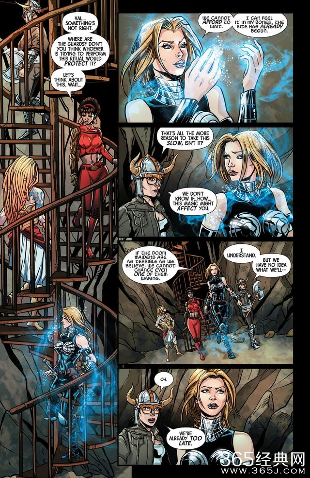 这里要说明一下,瓦尔基里(或者说女武神)是一个头衔,是一群人,不单指一个人,漫画主宇宙616最著名地瓦尔基里当属布仑希尔德(下图金发女子),还有地狱女武神丹妮尔月星。