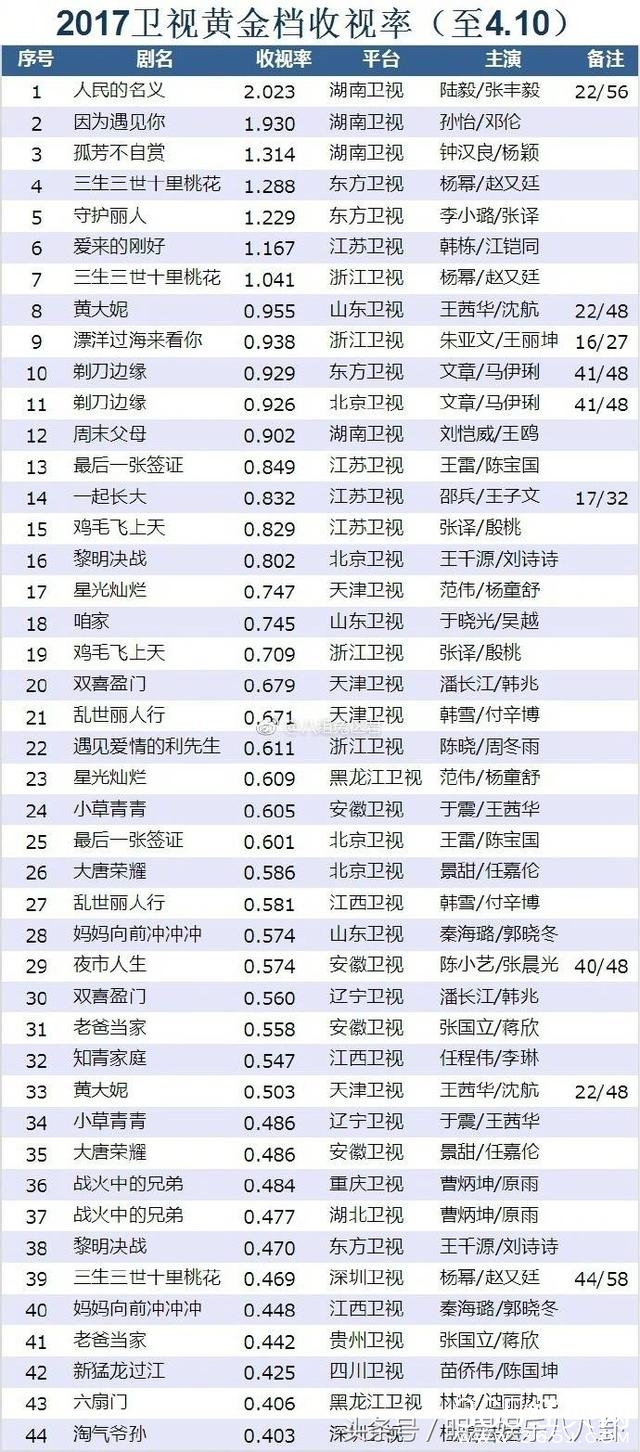 截止到4月10日,根据网友整理统计,2017年度省级卫视剧目黄金档收视排行,湖南卫视包揽了前三位置,再次凸显一线卫视平台的国民号召力,分别是第一名《人民的名义》,第二名《因为遇见你》,第三名《孤芳不自赏》;其中《人民的名义》和《因为遇见你》收视率均破3,而《人民的名义》有望成为今年上半年的剧王。