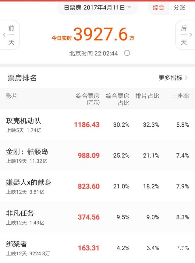 今天(4月11日)是周二,中国内地电影市场习惯性陷入低迷。截至22点,大盘报收3927万元。《攻壳机动队》以可怜的1186万元,名列榜首。上映19天的《金刚:骷髅岛》拿到988万元,累计票房11.32亿元,超过《极限特工:终极回归》和《生化危机:终章》,暂列今年进口片票房榜首,但随着周五《速度与激情8》的上映,估计冠军很快就会易主。
