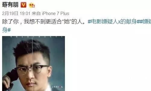 苏有朋没有出席她的婚礼,对外宣称,在筹备电影《嫌疑人x的献身》。