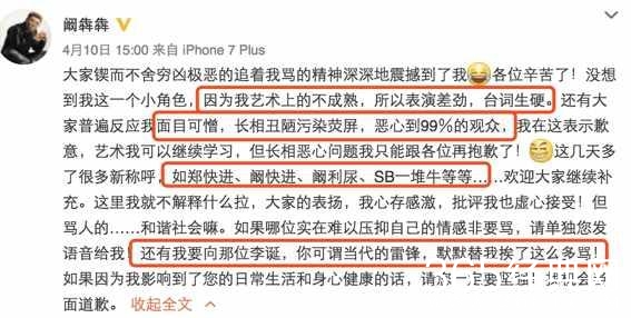 可能是大家骂的太狠了阚犇犇有点扛不住了特意在微博上自黑一下以此缓解大家的怒骂,阚犇犇微博说道:“我面目可憎长相丑陋,大家称呼我郑会快进、阚利尿、SB一堆牛,同时向李诞道歉。”
