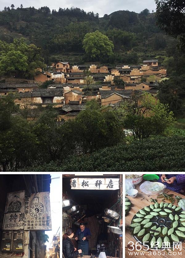 去时正值清明,路过的小吃店里,几人围坐在一起,包着一种类似青团的小吃,问是什么,答曰清明粿。买了几个,有咸有甜,先捧在手里吃着,期间又看到一间面馆,居然是用柴灶煮面。果断进去,点了两碗酒糟大肠面,女的动作麻利用手擀面,男的不慌不忙往灶头里添了柴火。十五分钟后面上来,装在青花海碗里,是手工切面,铺上深红的酒糟大肠、别有风味。店内装修古色古香,挂了许多照片,想必也是家老店。据店主介绍,这店是她祖父开的,祖父名百仙,所以就叫做佰仙面馆。已经传承了三代,松阳境内可以说远近驰名。