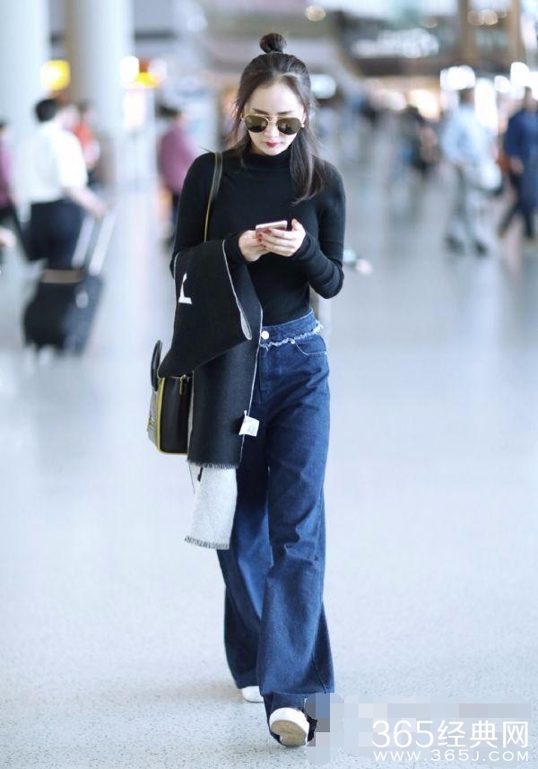 第三、杨幂 黑色紧身衣、阔腿裤、外披黑色披肩现身机场尽显高贵气质,扎丸子头不失俏皮。