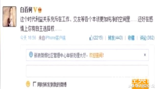 14年白百合删除所有跟陈羽凡相关的微博,还发了一条微博称:“这个时代利益关系充斥在工作、交友等各个本来该更加纯净的空间里……还好在感情上你有自主选择权……“。后来又妙删了这条意味深长的微博。