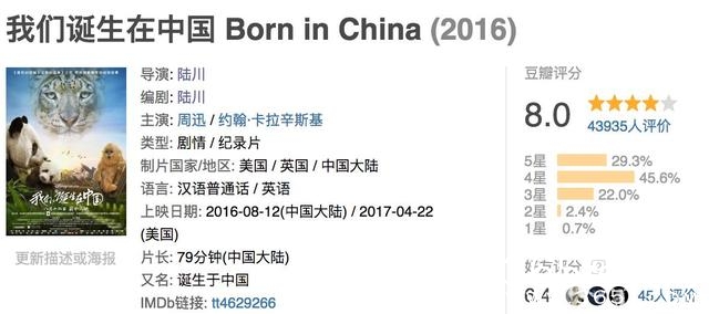 关于《我们诞生在中国》还有个幕后细节:陆川刚开始很不想拍大熊猫的素材,他觉得外国人对中国野生动物的认知也就是大熊猫这个水平了,而且他个人也觉得大熊猫这种动物过于萌了,太甜腻了。