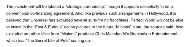 虽然对外宣传,这是一个“战略伙伴关系”实际上这看起来更像是融资协议。就像之前好莱坞惯有的安排那样,环球已经把最火的项目排除在外了,完美将不能投资《速度与激情》系列、《小黄人》系列,有内部人士表示,还包括《小黄人》所在公司照明娱乐公司的的其他项目,比如已经上映了的《爱宠大机密》。