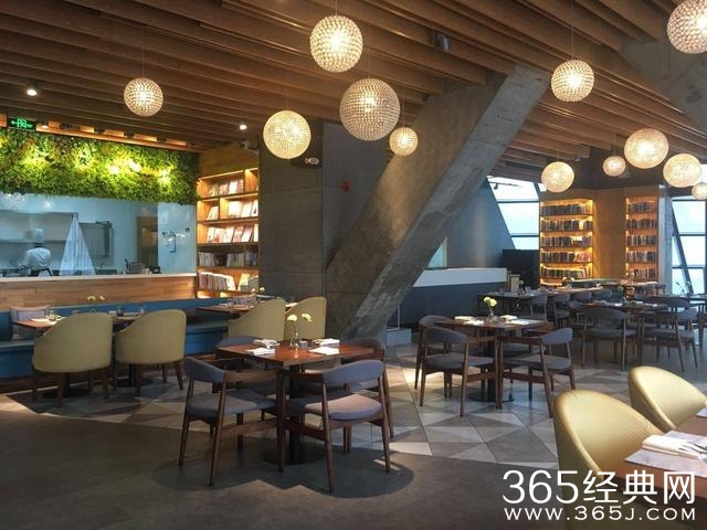 这家店位于商场三楼,面向室外观景平台。店内餐厅和图书区域由长廊相连,相对比较独立,餐饮面积大约350㎡,厨房采用半透明的形式。